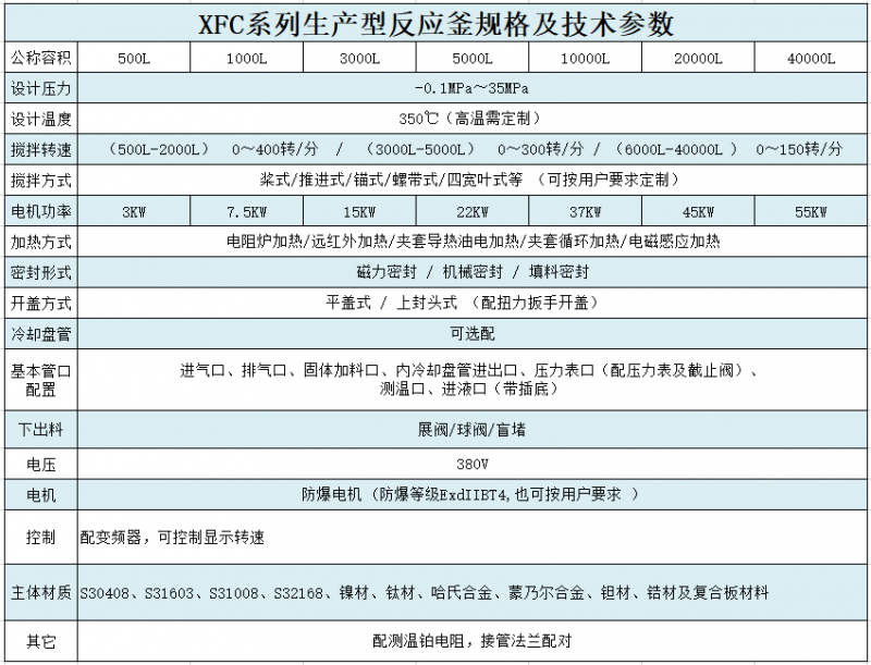 材質一般有碳錳鋼、不銹鋼、鋯、鎳基(哈氏、蒙乃爾、因康鎳)合金等有色金屬及其它復合材料,加熱/降溫方式,可分為電加熱、熱水加熱、導熱油循環加熱、蒸汽加熱、遠紅外加熱、外(內)盤管加熱、電磁感應加熱等,夾套降溫和釜內盤管降溫等。加熱方式的選擇主要跟化學反應所需的加熱/降溫溫度,以及所需熱量大小有關。攪拌器有錨式、框式、槳式、渦輪式,刮板式,組合式等多層復合槳。根據不同工作環境的工藝需要進行設計、制造。